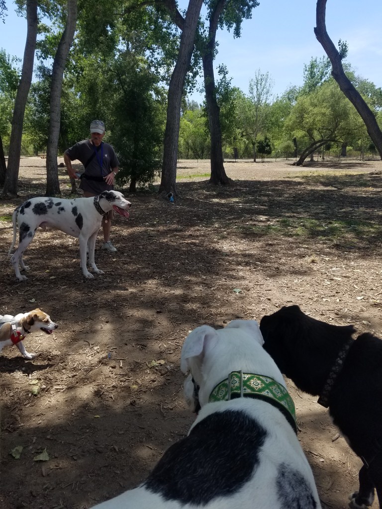Dexter is off and about at high speed, bounding between the Aussies, terriers, a couple of German Shepherd -mixes, and a young Rottie – having the time of his life. I kept Comet on a lead for several minutes. He wags his tail a little nervously, drool starting at the corner of his lip. I make a few apologies for him about his social anxiety. His being a rescue and all. Everyone is welcoming. But you can tell they are more relaxed with familiar dog-people and then warm up, to the new guy. Some fellow dog-people interact more easily with mutts bounding around.