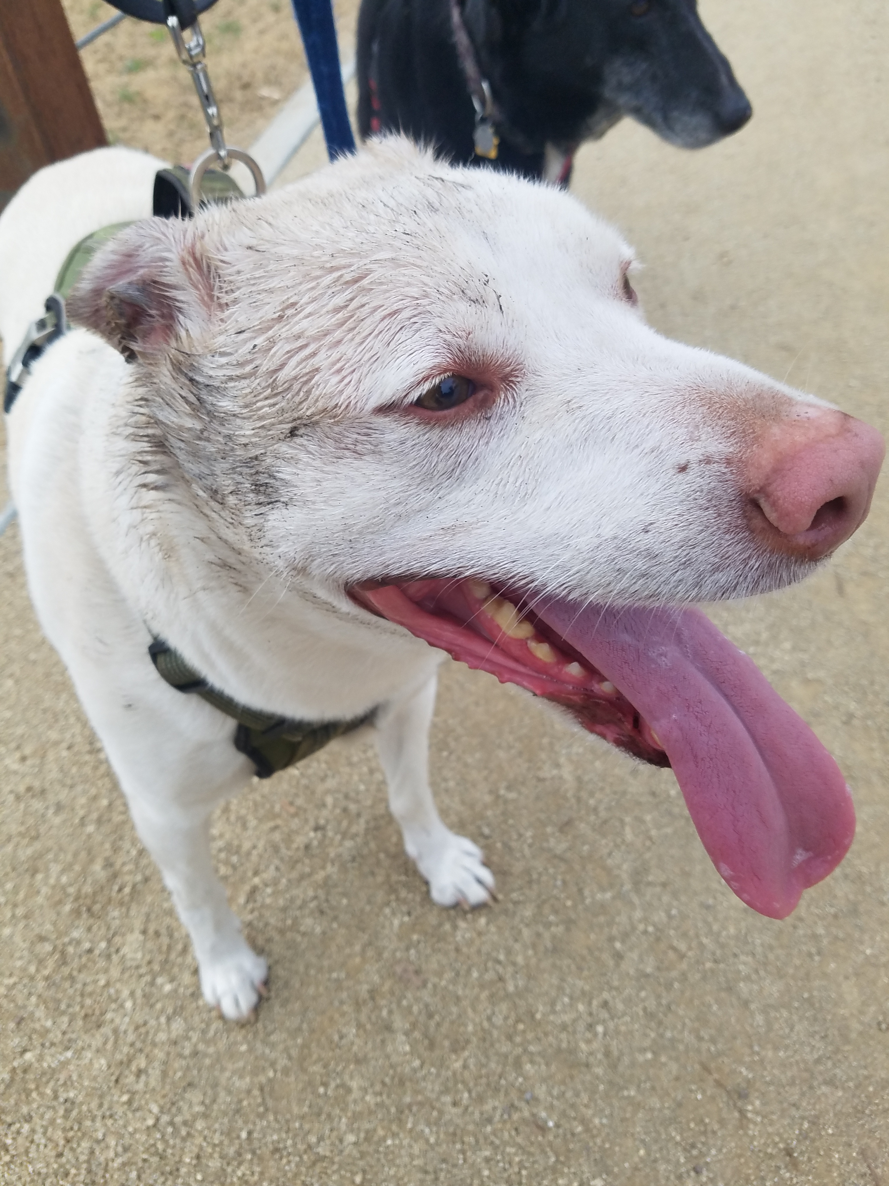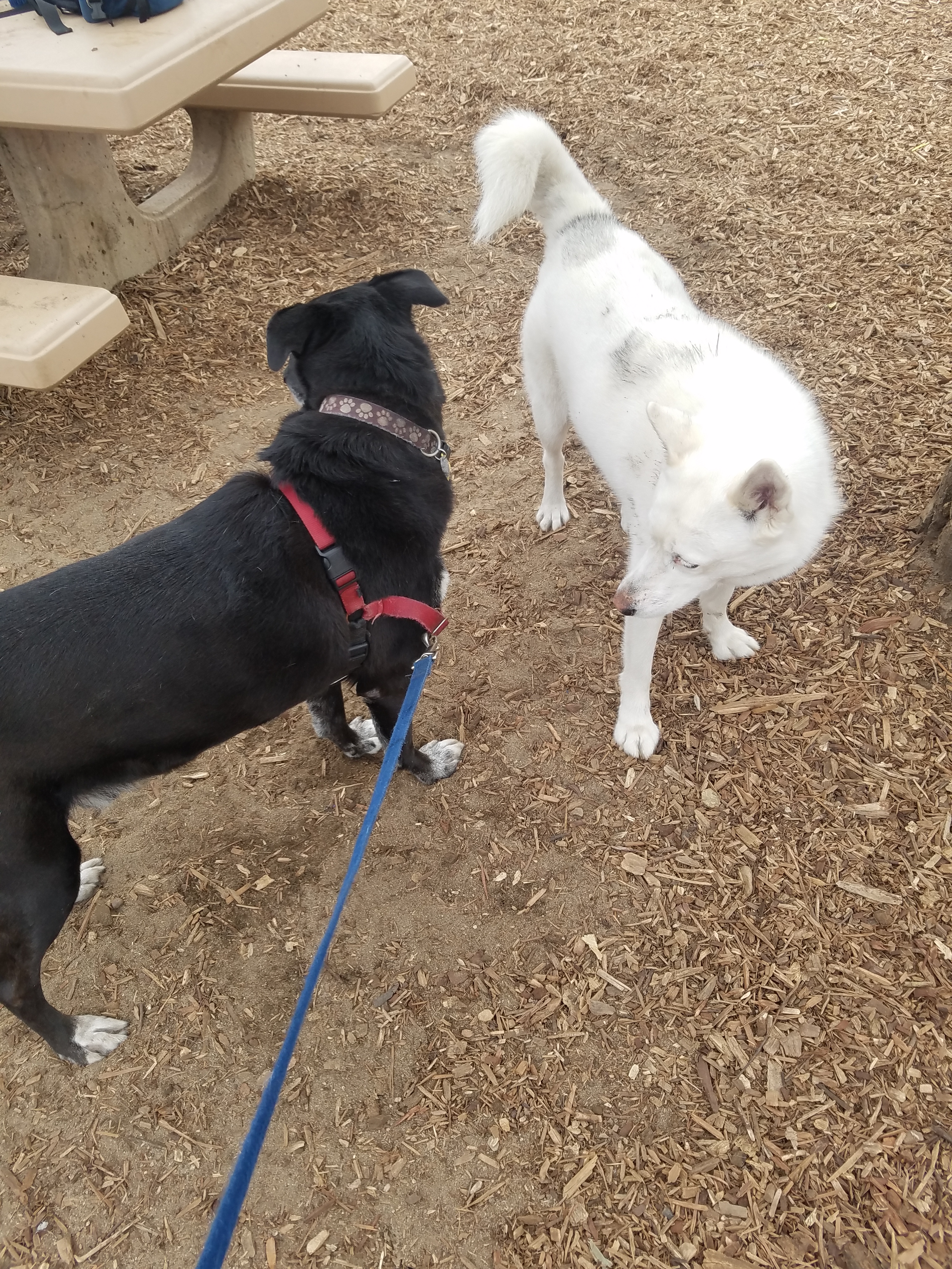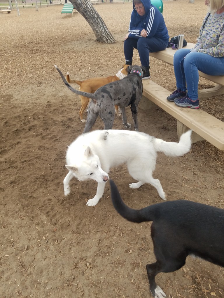 As we depart we pass a group of “special needs” adults. One stops to greet Dexter and Comet. She continues onward with a big smile. Imagine what a month of coming to this park will accomplish. I do not think Comet will become an extrovert like Dexter, but I think he might actually learn to have fun. Socializing is therapeutic.
