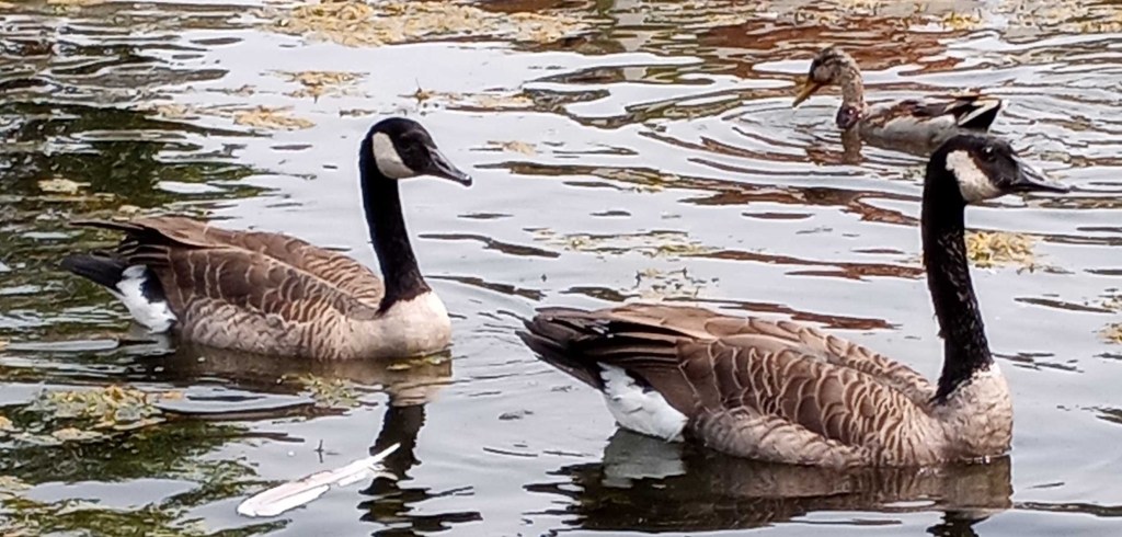 Dexter does not generally act as enthusiastic for species other than dogs or people. Not for the outdoor cat which adopted us recently. If only he was that territorial toward strangers! At Lindo Lake, with omnipresent dog- walkers all mandated to keep their pets leashed, the resident ducks and geese are wary but have no real interest in the dogs. Yet Dexter strained repeatedly to approach the waterfowl. Comet was content to take his cues from me. Among ducks, geese and heron at the lake, some were watching Dexter closely. Though Dexter was oblivious, the gander, with heads held high, wings extended and a warning honk for their charges, several suggested he (Dexter) would do well to walk on by.