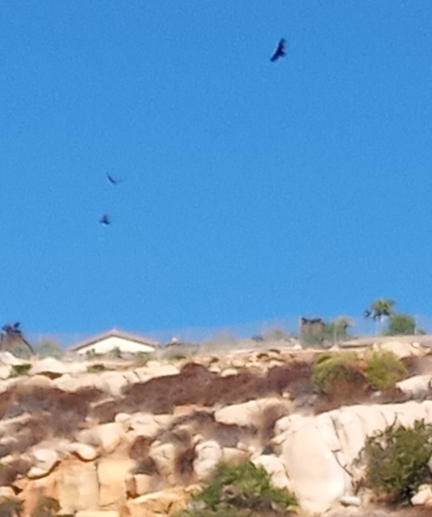 Any fan of Westerns (cowboys ‘n Indians), knows that buzzards circling overhead is a portent of misfortune. While the wild West is now only in fiction, our inland region does have all the other features – heat, dust, cactus, rattlesnakes, coyotes and raptors. Yet in all the time living in San Diego’s East County, I never have seen turkey vultures (cathartes aura) in the wild. But 2020, seeing buzzards is hardly surprising after the year we experienced. Earlier this week, Dexter, Comet and I were taking a late morning walk toward Rattlesnake Mountain and I spotted these birds circling the ridge. I first mistook them for hawks, but a neighbor I greeted corrected me. Though occasional reports via “neighbor” app that a small dog or cat has gone missing might suggest a coyote’s doing, most folks keep bigger dogs in the vicinity of the “wildlife habitat”. A few times in the early evening or morning this past summer, a coyote pack’s howling suggested they were content with rabbits or rodents in the “habitat”. Rabbits that we’ve seen on our pre-dawn dog walks suggest we can continue undeterred. On that late morning walk that day, I recalled a decades-old cartoon. I imagined Dexter staring like a Peanuts (cartoon) Snoopy “vulture” when he believes a certain feline is in the vicinity.