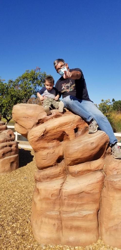 The old song about it never raining in Southern California (Albert Hammond ’72), is not entirely accurate. Still, I did not really expect the first weeks of January to be summer-like at 91F. These are the times to go to the Santee Lakes park. We bring duck food to feed the feathered mob which entertains our grandson. We have to watch as he tosses the corn not very far away from his feet, eyeing the Canada geese that are bold enough to peck the smaller ones under(webbed)foot. But then it is time to play. With parents still maintaining a COVID eye on their little ones, the few parents and their small children trade off using the playground. Watching another child use the slide or climb the little jungle gym, Zander nods when he wants Pop-pop to hoist him up and then catch him going down the slide. A few weeks ago, after a dozen hoists, Pop-pop would suggest he was ready for a nap. However, this week it seems Pop-pop is getting in shape running after Zander across a little bridge to realistic-looking boulders. He directs me to climb up and for Mam-mam to hoist him up becoming King of the Hill. Then Mam-mam, sensing me slowing down, suggests we all go get a cookie. And a nap for Pop-pop.