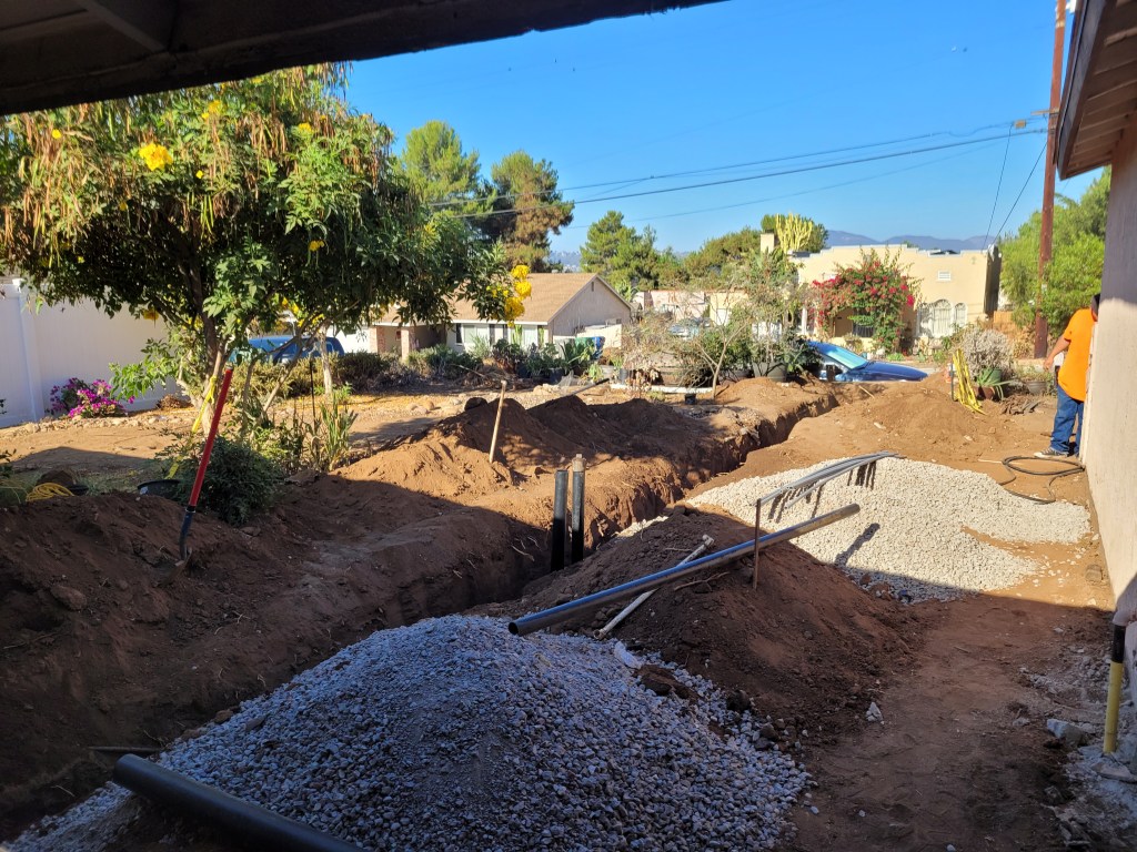 Taking the dogs for walks three and often, 4 times a day to keep them from soiling in the house, has meant threading piles of dirt and gravel and stepping through concrete dust. Comet is reaching an age where walking through gravel and rocks seems to cause him discomfort – he prefers to walk ( and worse, to relieve himself) on concrete. Dexter looks at me and then at the trenches, seemingly “Tell me again why you yell at me for digging up the yard?“.