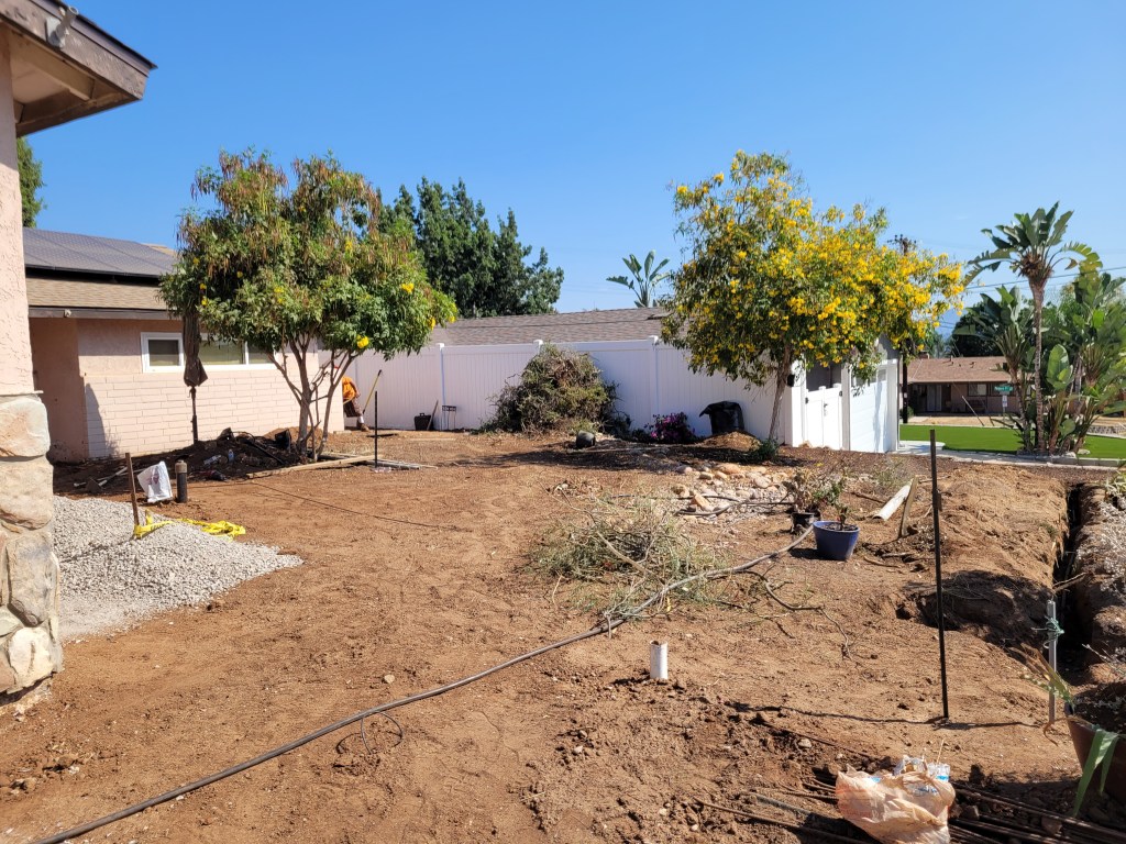 For twenty years or more, my relaxation from a hard week’s work was working in the dirt coaxing plants to remain green and healthy. In the era of Climate Change, with poor soil and watering restrictions, it was labor-intensive. And keeping things healthy with dogs intent on peeing on them was continual work. For work like what is going on these days, I may have some memory of labor I did in my Twenties, but to obtain the result my wife and I want, I have experts.