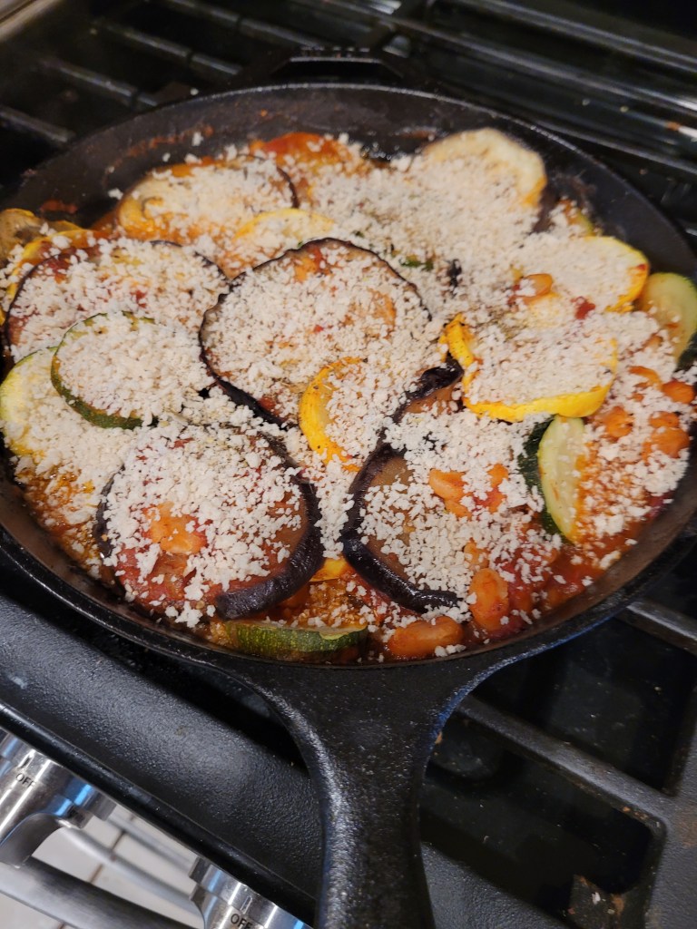 If we were the sort to make New Years’s resolutions, deciding to plan meals rather than toss together something quick from what we have on hand- would be one. When COVID quarantines resulted in us binge-watching cooking and baking shows, I started occasionally to doctor familiar recipes with coriander and cumin. After trying a recipe with some different aromatic spices and holding back (for me) chiles – I am allergic to them – we started to think about planning meals for the week to eat better at home. A highlight of this week was a recipe torn out of a year-old Better Homes and Gardens magazine; a meatless dish called Ratatouille Cassoulet. With the exception of red bell pepper, which I purposely left out, the dish was prepared exactly as written. Here’s the recipe from BHG: