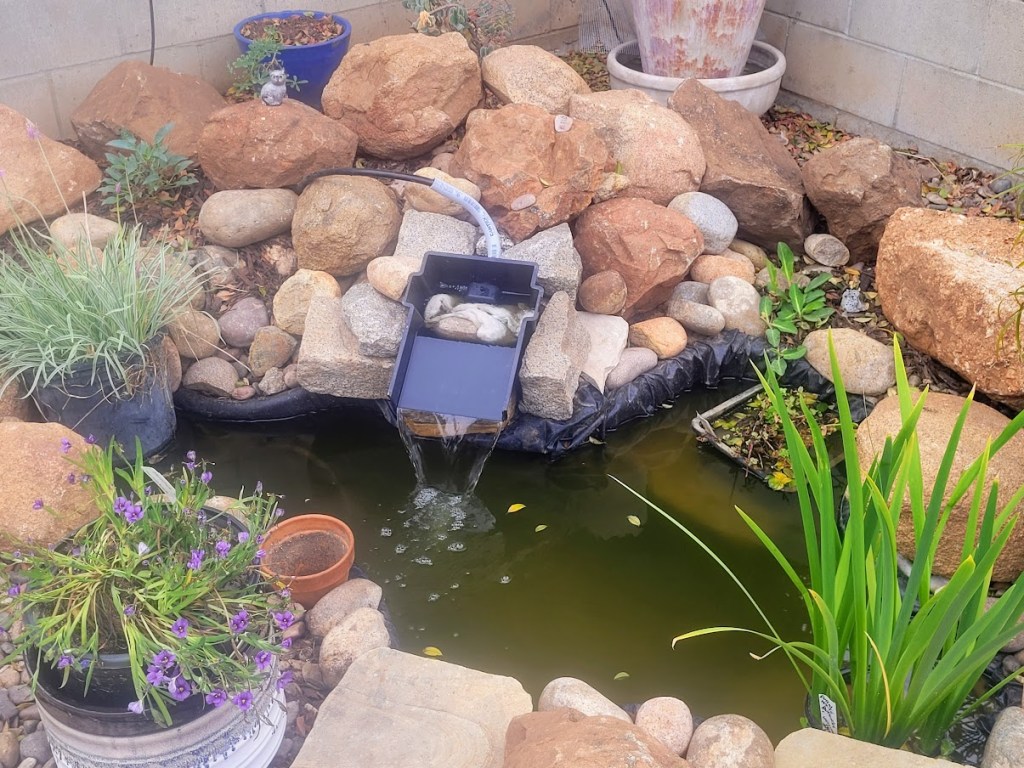 I was attempting to set a little “waterfall” among the stones, and secure it. Not satisfied, when I attempted to adjust it later, it, a small stone, and the debris filter slid into the pond. Fish scattered. I retrieved everything and reset them more carefully. A couple hours later, the water was clearer, and the goldfish seemed fine. The following day, I was cleaning the filter material, but decided to adjust the waterfall for a better flow, and a big stone, a smaller stone, the plastic waterfall and filter slid, and everything went into the pond with a huge splash. A few choice words slipped out (I am a veteran after all). I got everything back in place and functioning again. Yesterday, hoped I would not see “floaters” as we were having family over. That afternoon our little grandchildren were able to confirm the three goldfish were still alive.